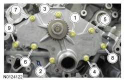 8. Install the 2 new RH VCT (Variable Camshaft Timing) bolts and tighten in 4 stages.