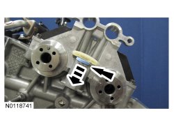 38. NOTICE: Do not use excessive force when installing the Variable Camshaft Timing (VCT) oil control solenoid. Damage to the mega cap could cause the cylinder head to be inoperable. If difficult to install the VCT (Variable Camshaft Timing) oil control solenoid, inspect the bore and VCT (Variable Camshaft Timing) oil control solenoid to ensure there are no burrs, sharp edges or contaminants present on the mating surface. Only clean the external surfaces as necessary.