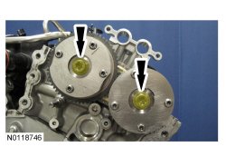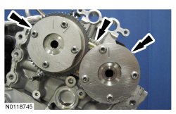 16. Install the 2 new LH VCT (Variable Camshaft Timing) bolts and tighten in 4 stages.