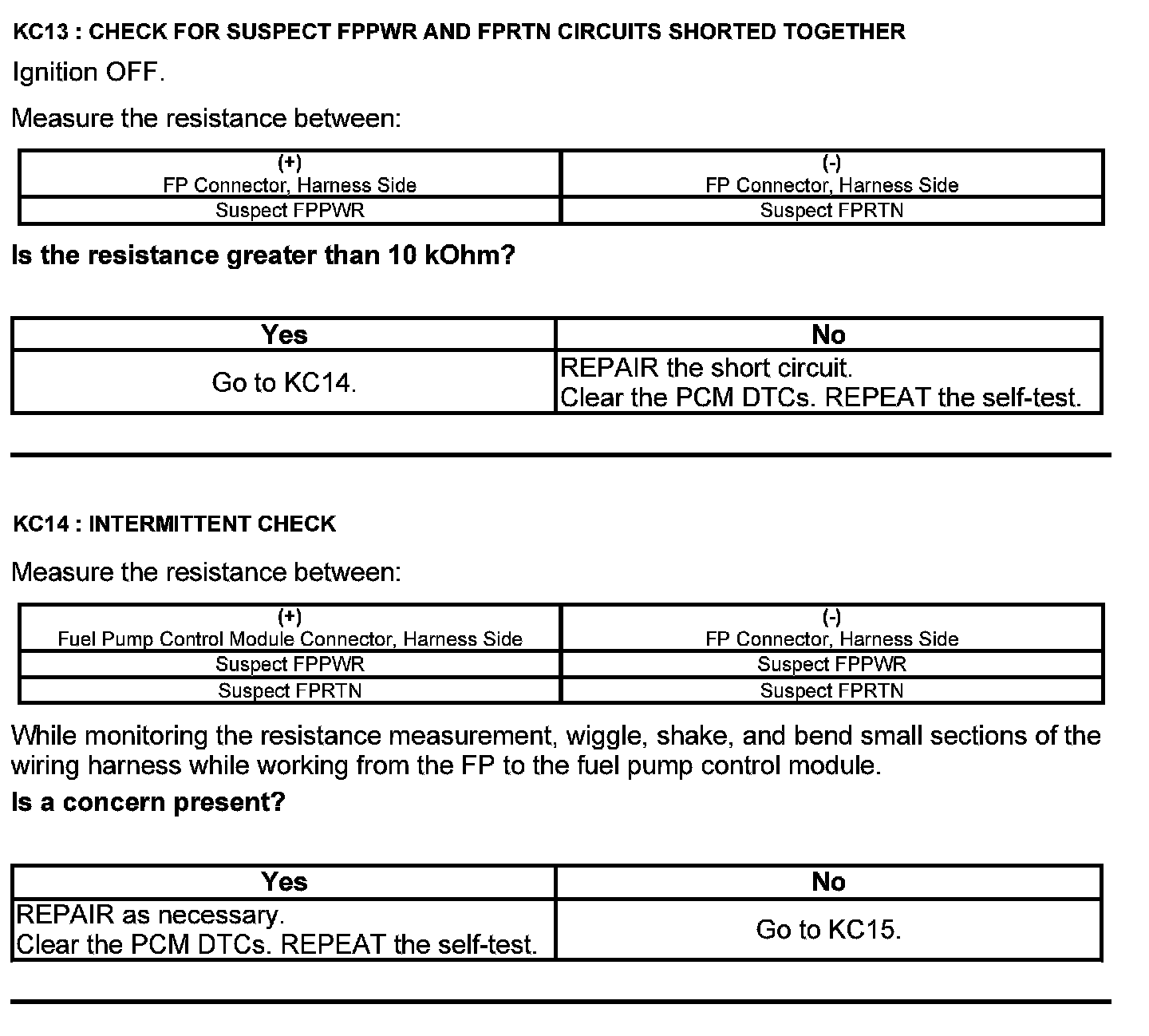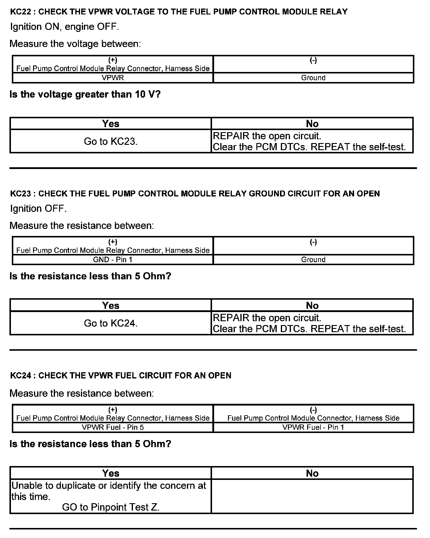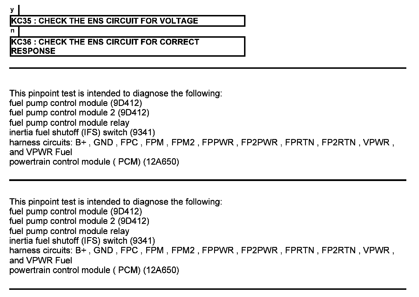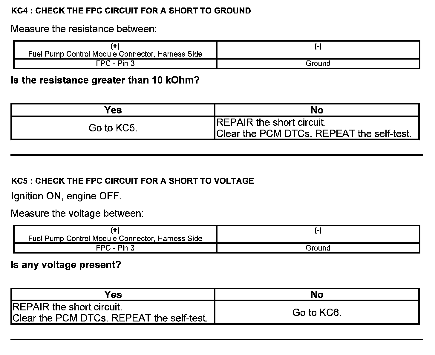 Home >> Ford >> 2012 >> Mustang V6-3.7L >> Repair and Diagnosis >> Powertrain Management >> Computers and Control Systems >> Testing and Inspection >> Pinpoint Tests >> Test KC: Fuel Pump Control Module