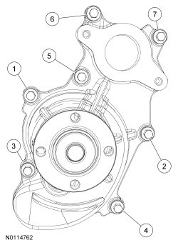Tighten the coolant pump bolts in the sequence shown in 2 stages.