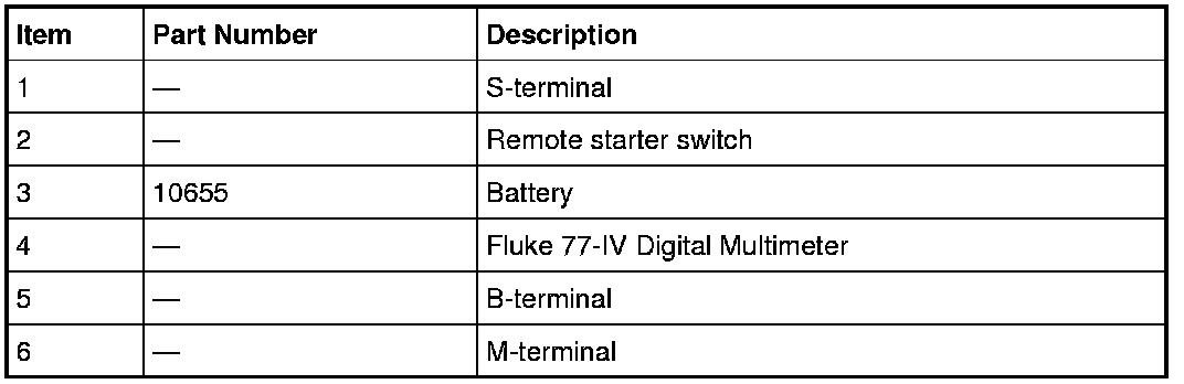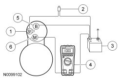 7. Remove the cables from solenoid B, S and M-terminals. Clean the cables and connections and reinstall the cables to the correct terminals. Repeat Steps 3 through 6. If the voltage drop reading is still greater than 0.5 volt when checked at the M-terminal and less than 0.5 volt when checked at the B-terminal, the concern is in the solenoid contacts. Install a new starter motor.