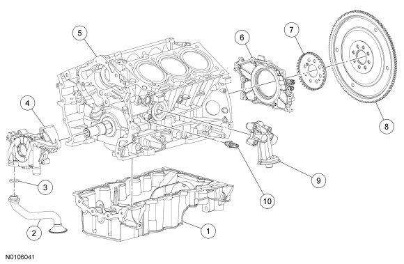 - Apply a 5.5 mm (0.21 in) bead of Motorcraft(R) High Performance Engine RTV Silicone to the 2 crankshaft seal retainer plate-to-cylinder block joint areas on the sealing surface of the oil pan.
