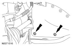 18. Position the RH engine splash shield and install the 2 lower pin-type retainers.