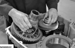 202. Tilt the transfer shaft and gear assembly over and install the differential assembly.