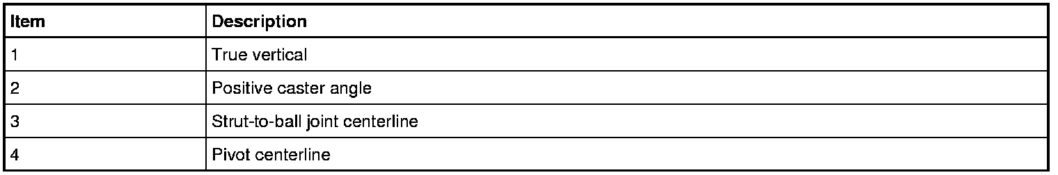Caster is the deviation from vertical of an imaginary line drawn through the pivot points (top of strut and lower ball joint), when viewed from the side. The caster specifications will give the vehicle the best directional stability characteristics when loaded and driven. The caster setting is not related to tire wear. The caster setting is not adjustable.