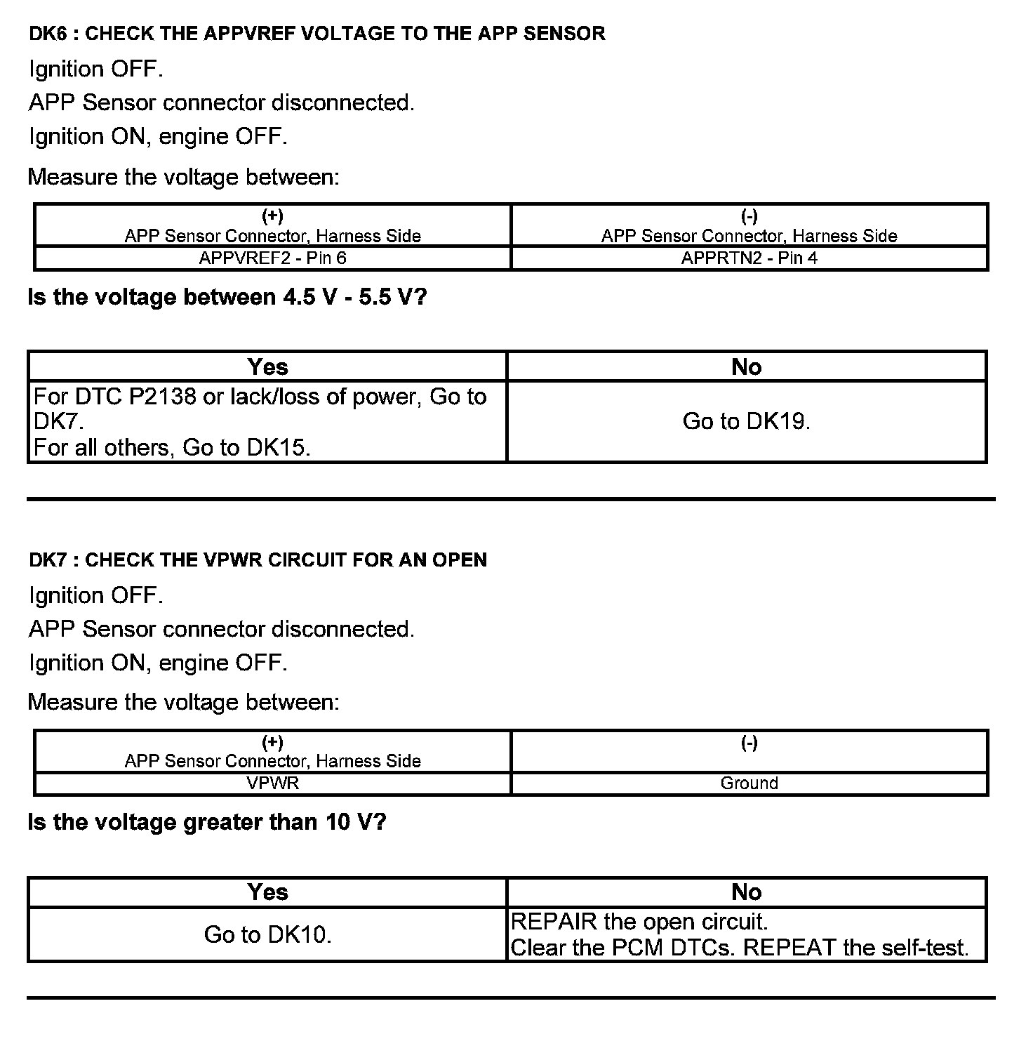 Home >> Ford >> 2012 >> Taurus FWD V6-3.5L >> Repair and Diagnosis >> Powertrain Management >> Computers and Control Systems >> Testing and Inspection >> Pinpoint Tests >> Test DK: Accelerator Pedal Position (APP) Sensor
