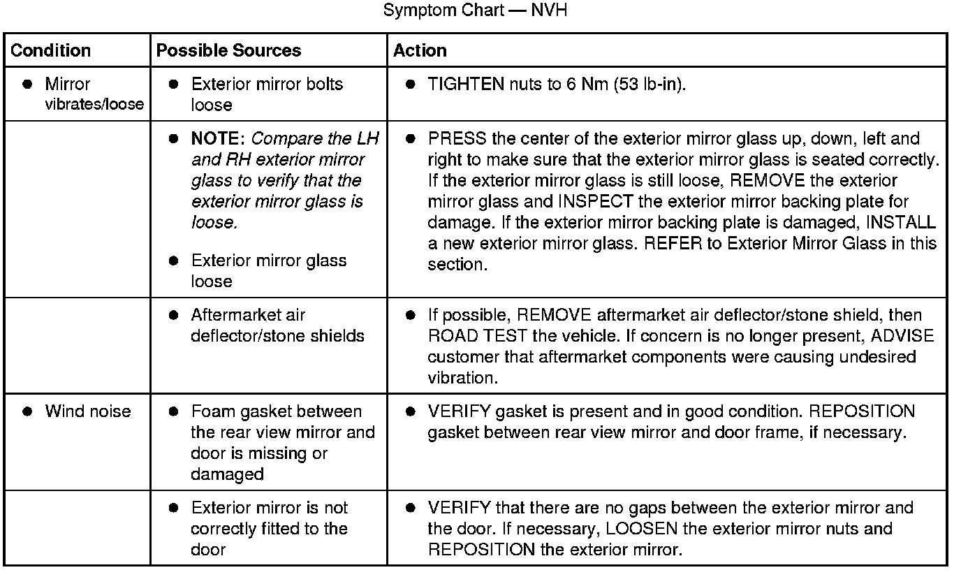 NOTE: NVH symptoms should be identified using the diagnostic tools that are available. For a list of these tools, an explanation of their uses and a glossary of common terms, refer to Vehicle Noise, Vibration, and Harshness. Since it is possible any one of multiple systems can be the cause of a symptom, it may be necessary to use a process of elimination type of diagnostic approach to pinpoint the responsible system. If this is not the causal system for the symptom, refer back to Vehicle Noise, Vibration, and Harshness for the next likely system and continue diagnosis. Testing and Inspection