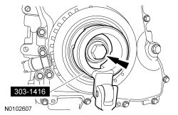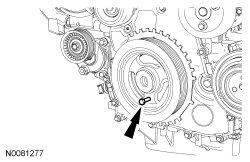 Install a new crankshaft pulley bolt. Use the Crankshaft Damper Holding Tool and a suitable 1/2-in drive hand tool to hold the crankshaft pulley, tighten the crankshaft pulley bolt in 2 stages: