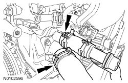 111. Connect the oil cooler hose and lower radiator hose to the thermostat housing.