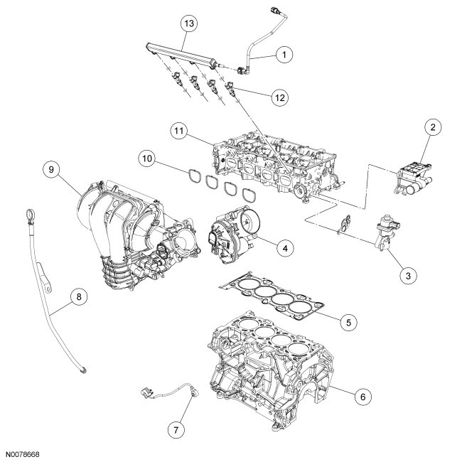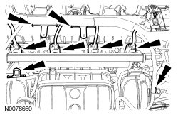 100. Install the fuel rail with the fuel injectors and the 2 bolts.