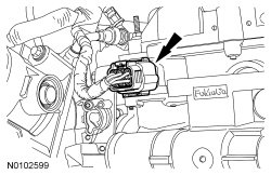 102. Attach the wiring harness retainer on the valve cover stud.
