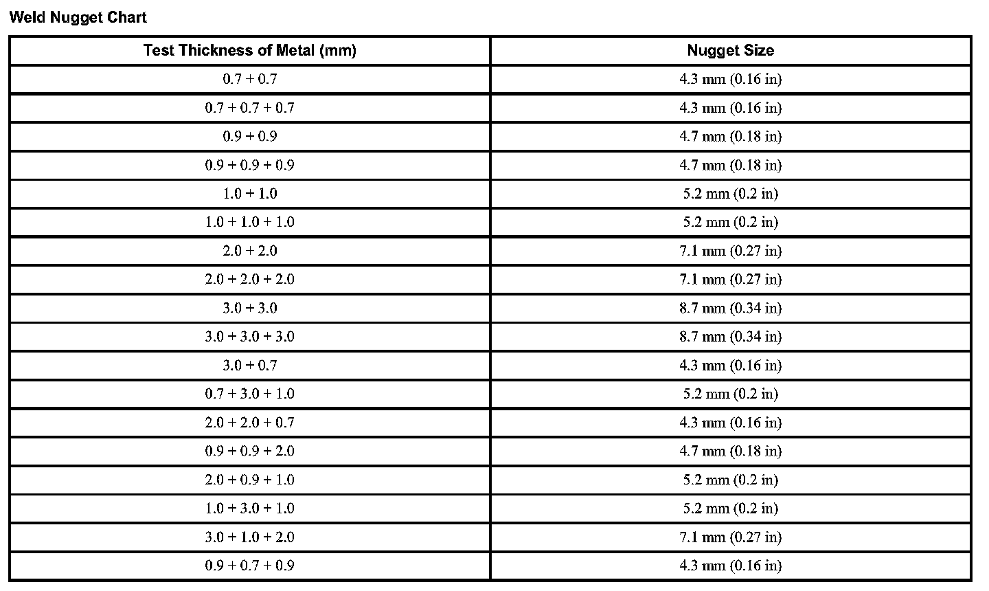 Home >> Ford >> 2012 >> Transit Connect L4-2.0L >> Repair and Diagnosis >> Specifications >> Mechanical Specifications >> Body and Frame >> System Specifications >> Weld Nugget Chart