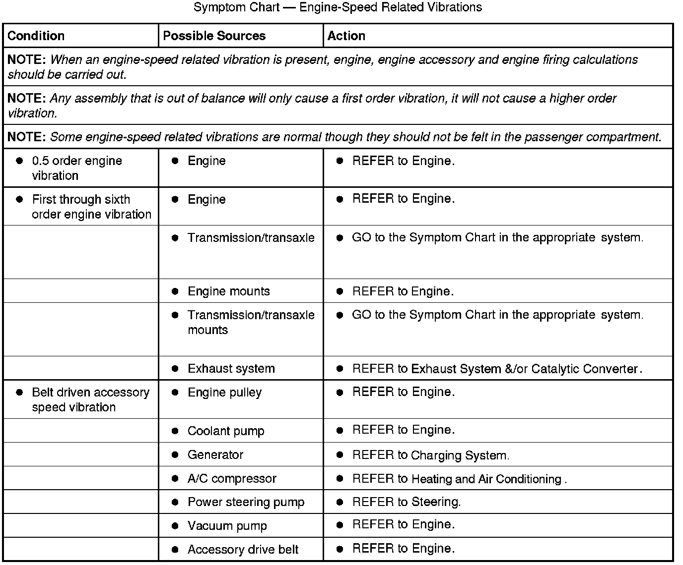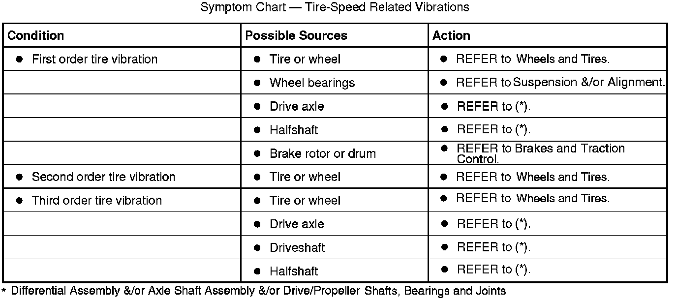Use the diagnostic instructions along with the necessary listed tools to identify the vibration order and to isolate the symptom and the possible systems associated with that symptom. Then based on the results from the road test, make a determination of which action in the symptom chart to take first. Since it is possible any one of multiple systems may be the cause of the symptom, it may be necessary to use a process of elimination type diagnostic approach to pinpoint the concern. Refer to the system(s) indicated to identify and isolate the cause or rule that system out as being the causal system for the symptom.