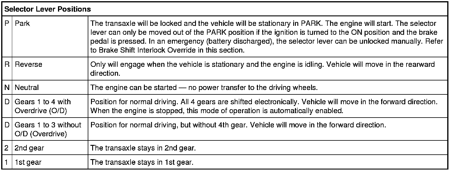 The brake shift interlock system prevents the selector lever from being moved out of the PARK position unless the requirements to do so are met. The ignition switch must be in the ON position and the brake pedal must be pressed to move the selector lever out of the PARK position. The brake pedal position is detected by the Brake Pedal Position (BPP) switch. In the event the selector lever will not come out of PARK (dead battery), the manual override button will mechanically bypass the electronic portion of the brake shift interlock system and allow the selector lever to be moved out of the PARK position. The manual override button is part of the selector lever assembly.