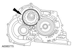 64. NOTICE: Hold the final drive input gear while removing the bearing to prevent it from falling out of the transaxle case or damage to the input gear can occur.