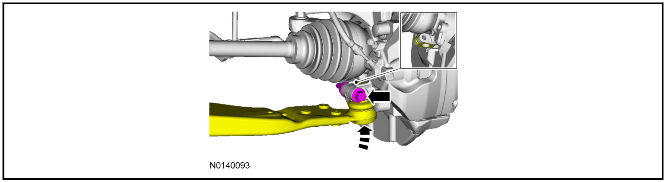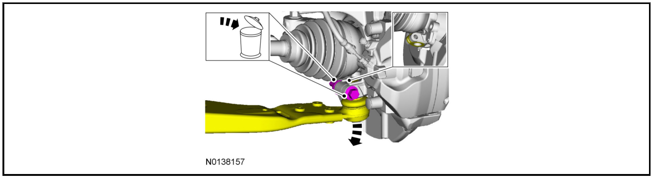 - Use care when releasing the lower arm and wheel knuckle into the resting position or damage to the ball joint seal and/or Constant Velocity (CV) joint boot may occur.