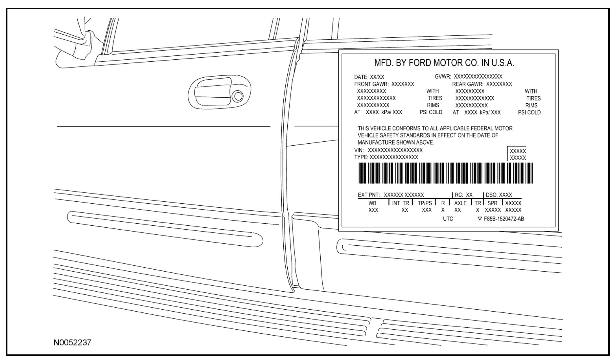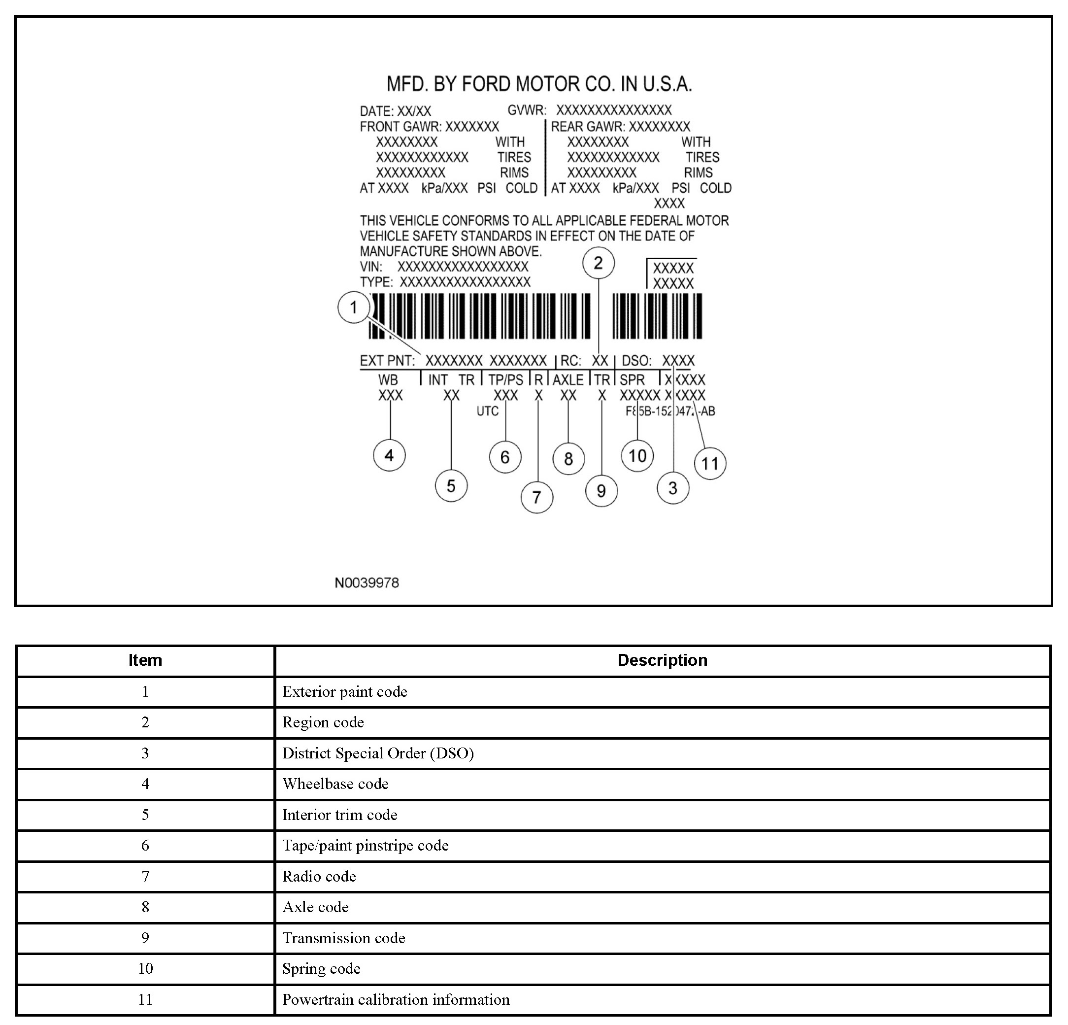 The Vehicle Certification (VC) label contains the manufacturer name, the month and year of manufacture, the certification statement and the Vehicle Identification Number (VIN). It also includes Gross Vehicle Weight Rating (GVWR).