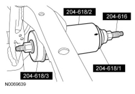 Assemble the RDU 204-618 and RDU 204-616 to the rear subframe and press out the bushing.