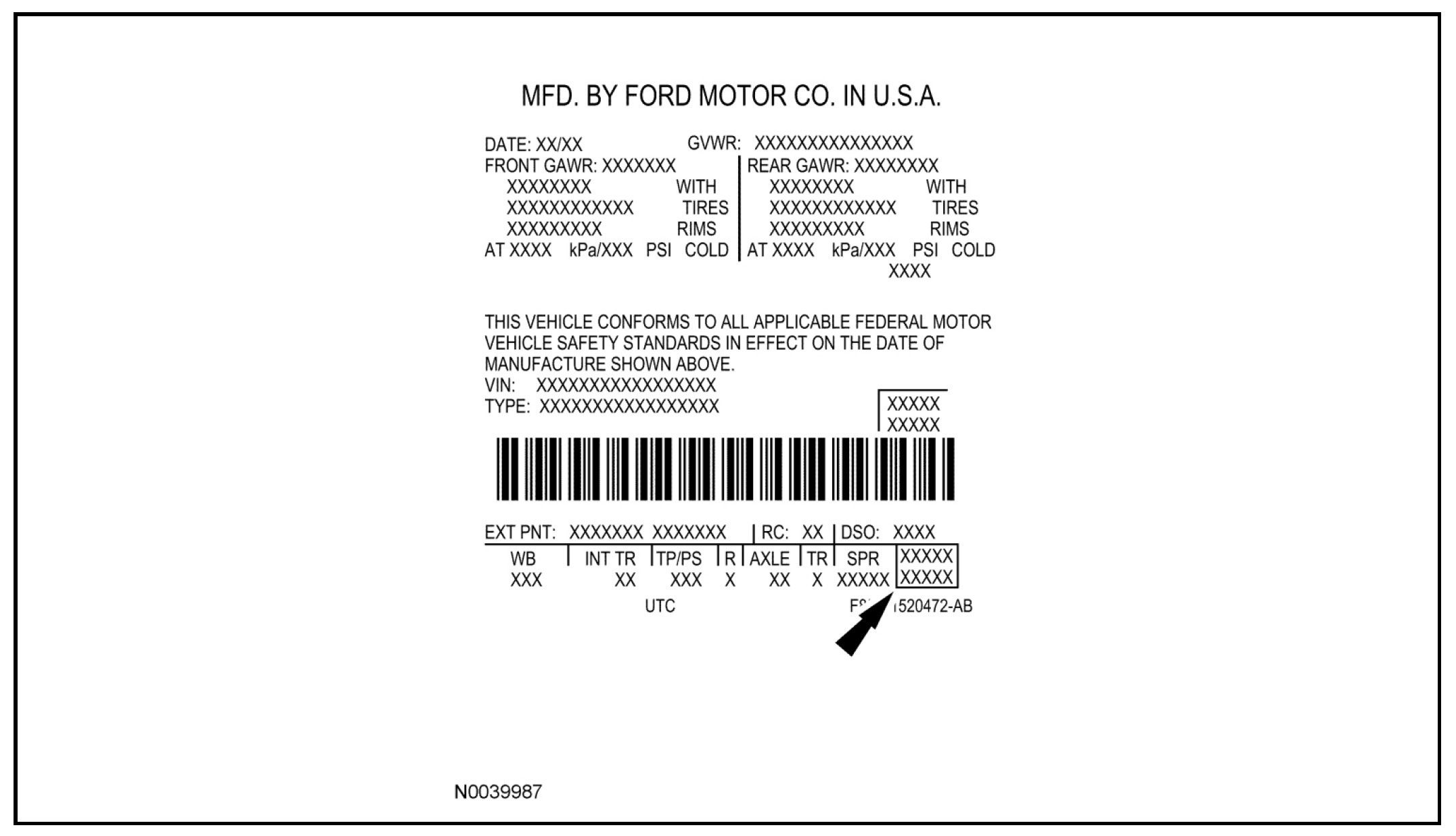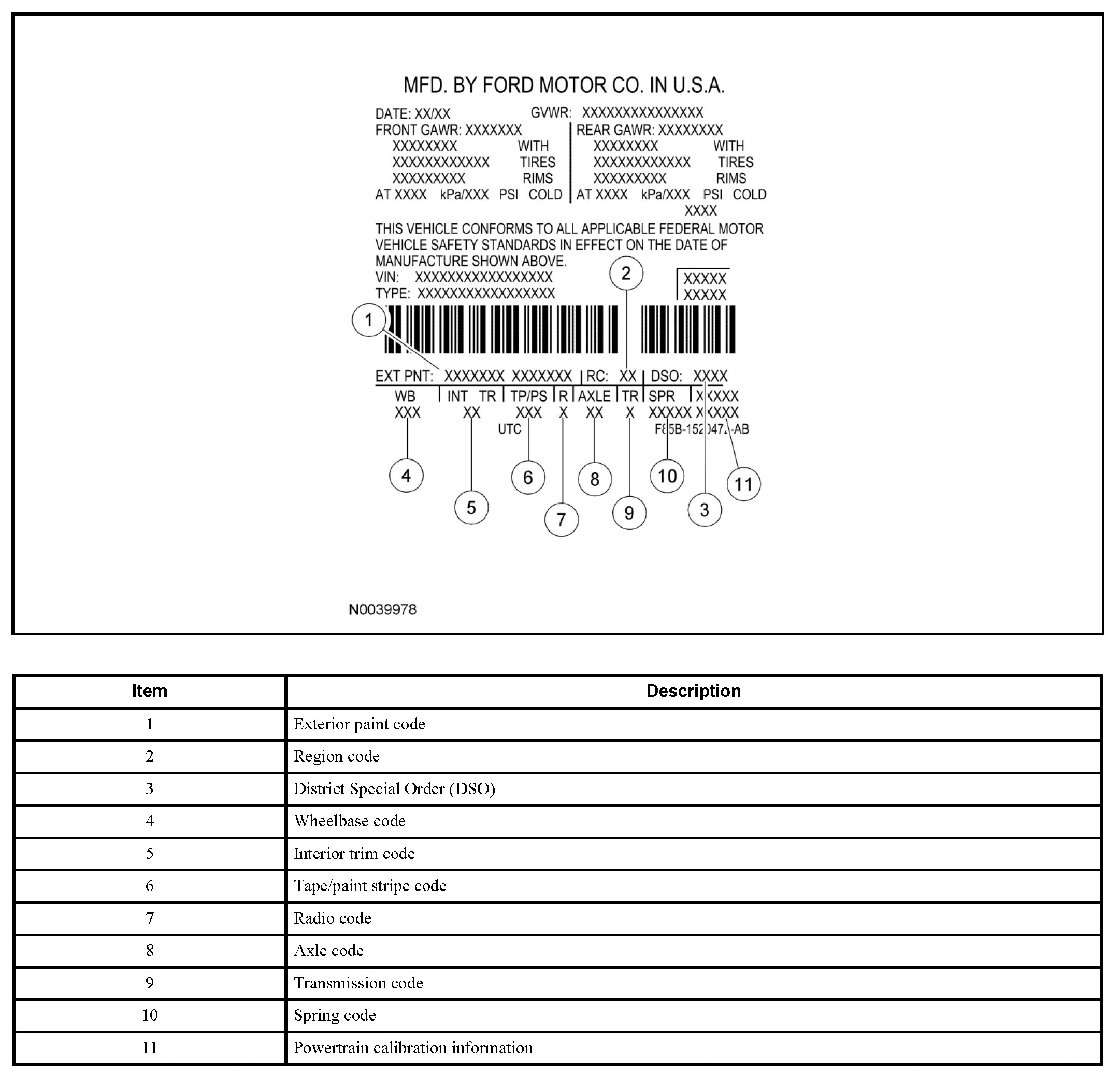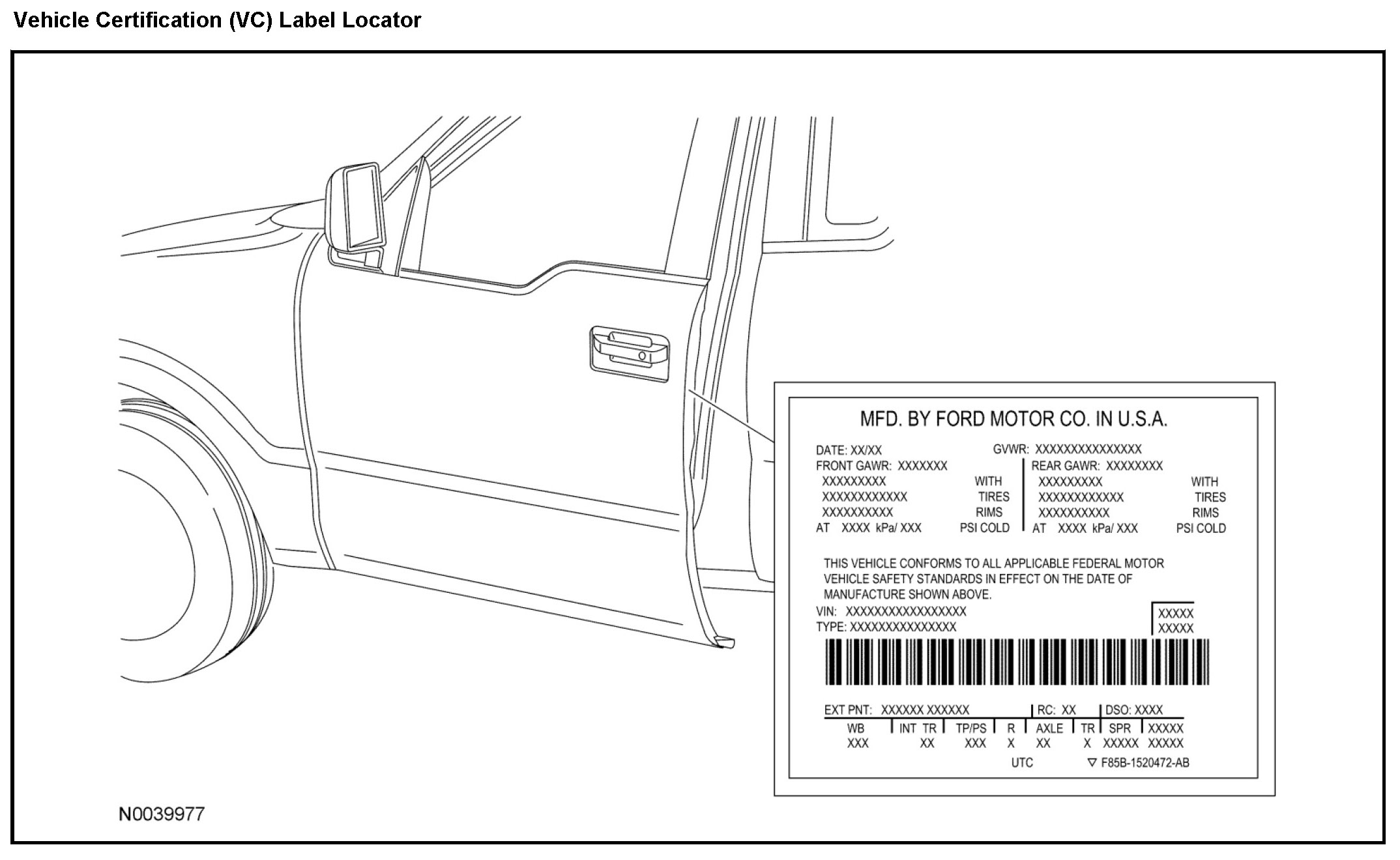 The Vehicle Certification (VC) label contains information on the manufacturer name, the month and year of manufacture, the certification statement and the Vehicle Identification Number (VIN). This label also includes Gross Vehicle Weight Rating (GVWR) information.