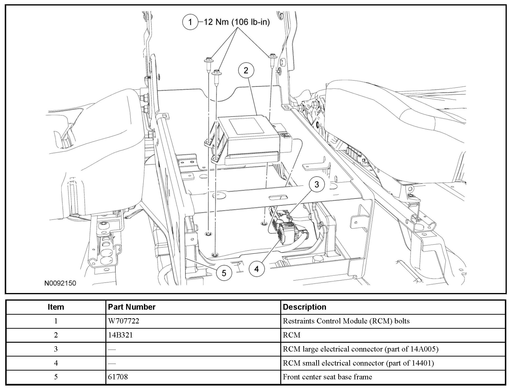 WARNING: Always tighten the fasteners of the restraints control module (RCM) and impact sensor (if equipped) to the specified torque. Failure to do so may result in incorrect restraint system operation, which increases the risk of personal injury or death in a crash.
