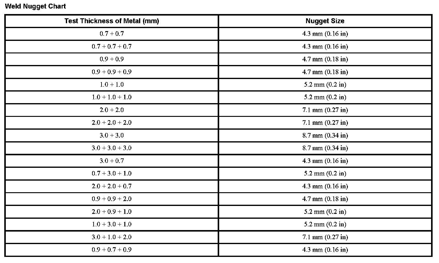 Weld Nugget Chart