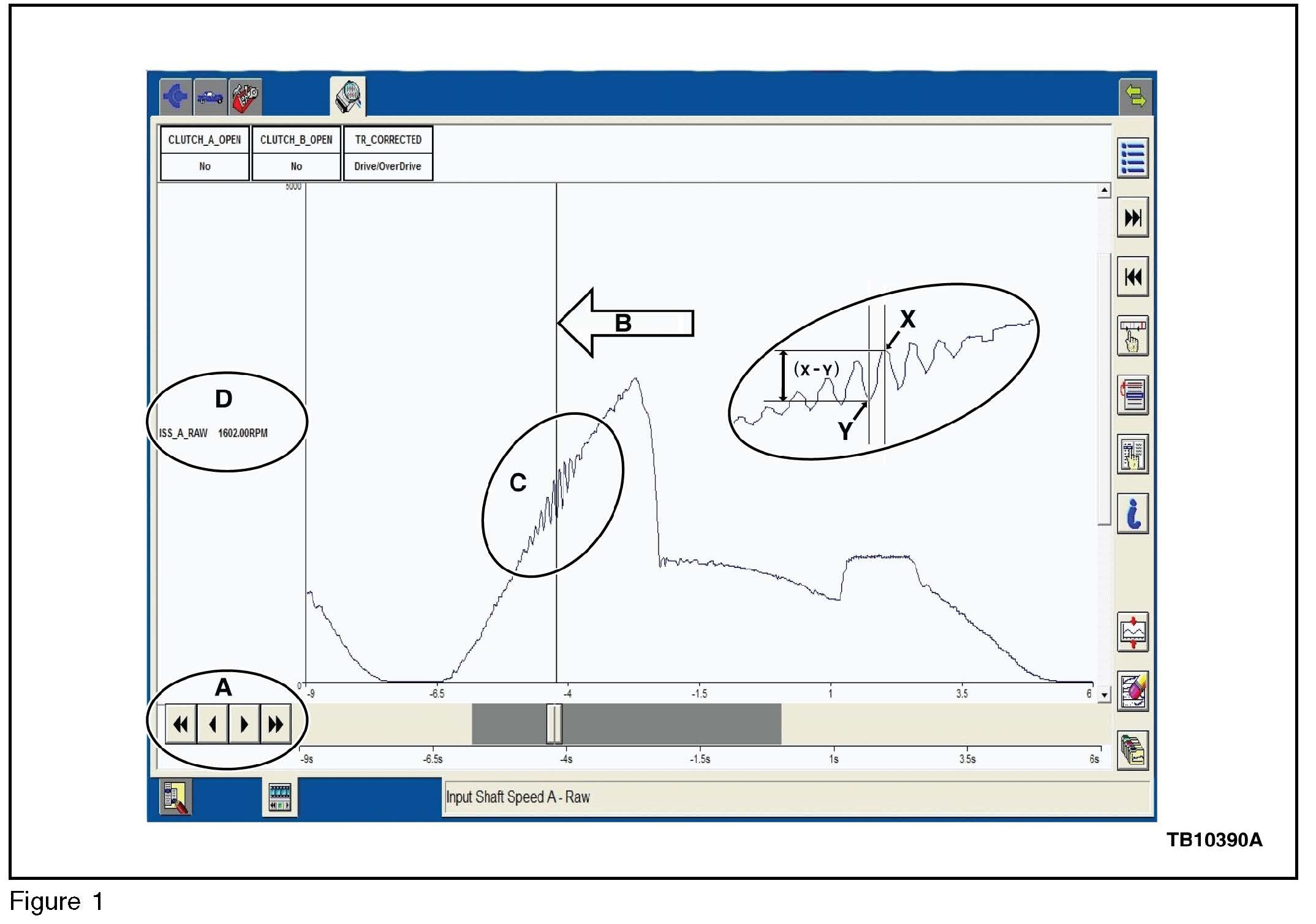7. Using the playback feature within Datalogger (arrow controls A), position the playback time cursor (B) over the area of the shudder event (C) of the ISS_A_RAW PID. (Figure 1)