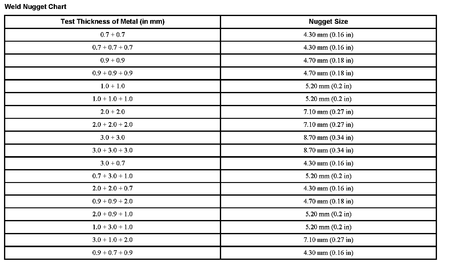 Weld Nugget Chart
