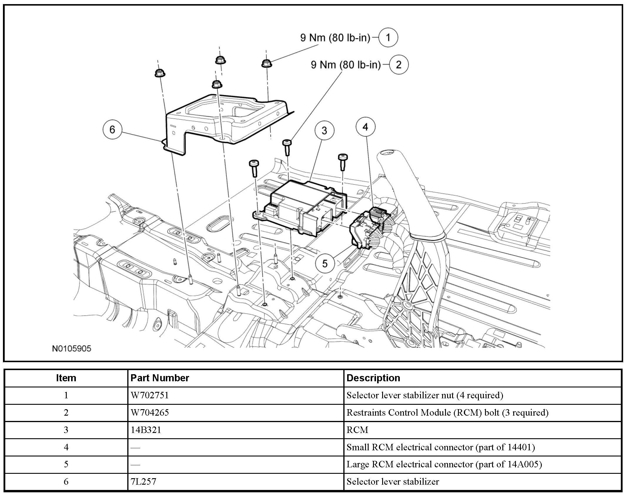 1. WARNING: Always tighten the fasteners of the restraints control module (RCM) and impact sensor (if equipped) to the specified torque. Failure to do so may result in incorrect restraint system operation, which increases the risk of personal injury or death in a crash.
