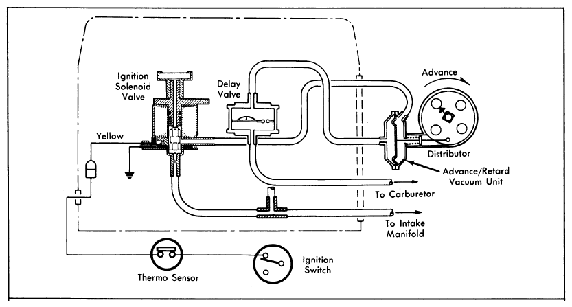 2. With engine idling at normal operating temperature, there should be vacuum to distributor vacuum retard unit. If no vacuum is present, check for vacuum at ignition solenoid valve. If no vacuum is present at solenoid valve, clean intake manifold vacuum port.