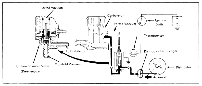 2. If correct vacuum reading is not obtained, check voltage at ignition solenoid valve with ignition on. If voltage is present, solenoid valve is defective or vacuum passage is plugged. Repair or replace as necessary.