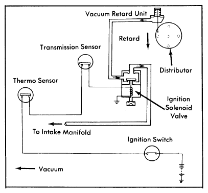 2. With engine idling at normal operating temperature, there should be vacuum to distributor vacuum retard unit. If no vacuum is present, check for vacuum at ignition solenoid valve. If no vacuum is present at solenoid valve, clean intake manifold vacuum port.