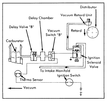 2. With engine idling at normal operating temperature, there should be vacuum to distributor vacuum retard unit. If no vacuum is present, check for vacuum at ignition solenoid valve. If no vacuum is present at solenoid valve, clean intake manifold vacuum port.