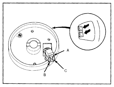 Check control switch continuity. There should be continuity between terminals A and C when "SET" switch is in the on position, and continuity between terminals A and B with "RESUME" switch in on position. See Figure.