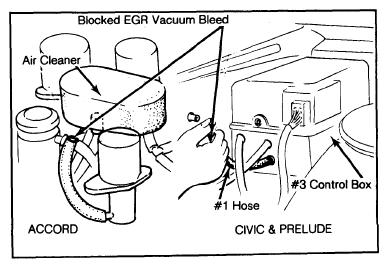 2. If vacuum is present, check for voltage at EGR control solenoid valve A (Blue/Yellow wire at emission control box connector on Accord models or Blue wire at box #2 on Civic and Prelude models).