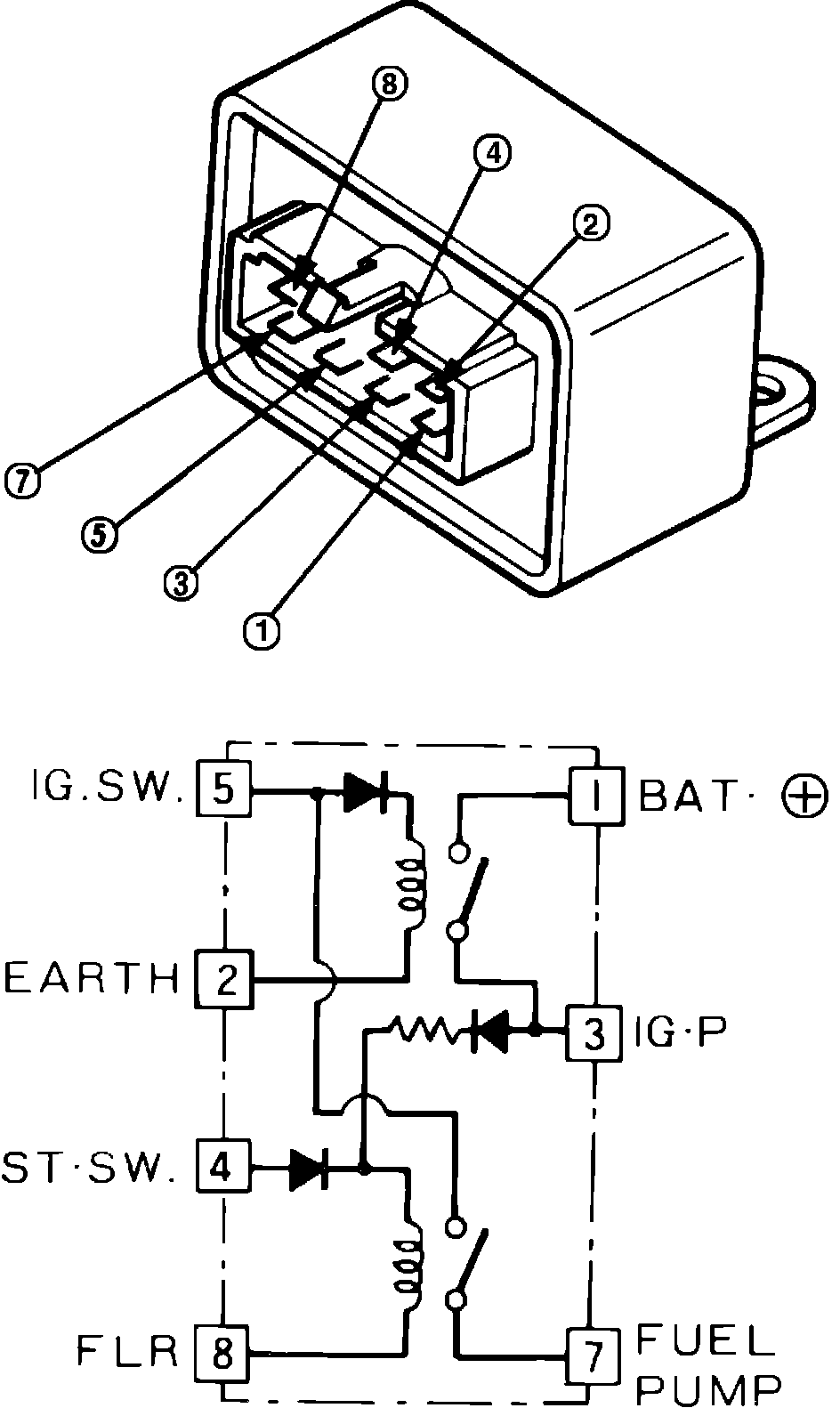 7. Check for continuity between the No.5 and No.7 terminals. If there is continuity then the relay is good, if the fuel pump is still inoperative then proceed to harness testing. If there is no continuity then replace the relay.