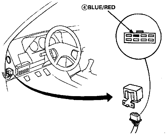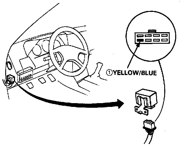 2. Connect the positive probe of the circuit tester to the Yellow/Blue wire (1) in the coupler and ground the negative probe of the tester to body ground. If battery voltage is available, proceed to step 3. If there is no battery voltage, check the wiring between the battery and the main relay as well as the No.1 fuse in the engine compartment.