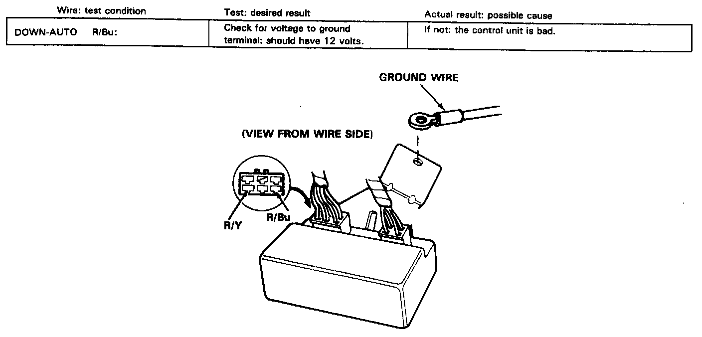 Output Test: The control unit couplers are reconnected and the control unit ground wire is disconnected with ignition switch ON.