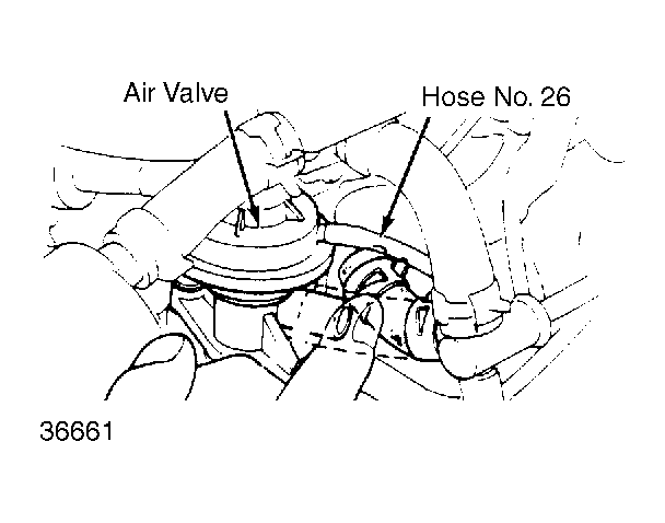 5. If there is no vacuum present, disconnect vacuum hose No. 26 from air valve. Check for vacuum at hose No. 26 during deceleration above 3500 RPM.