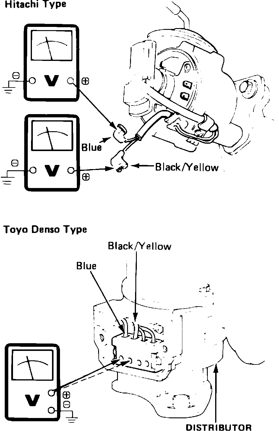 2. Check voltage between blue wire and ground, then between black/yellow wire and ground with ignition switch in ON position, Fig. 1. Battery voltage should be present. On models with Toyo Denso distributor, two blue wires are used. Be sure to perform voltage check on blue wire indicated in Fig. 1.