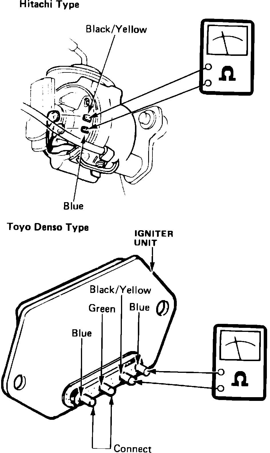 1. On models with Hitachi distributor, disconnect lead wires from igniter unit. On models with Toyo Denso distributor, remove igniter cover and pull out igniter unit.