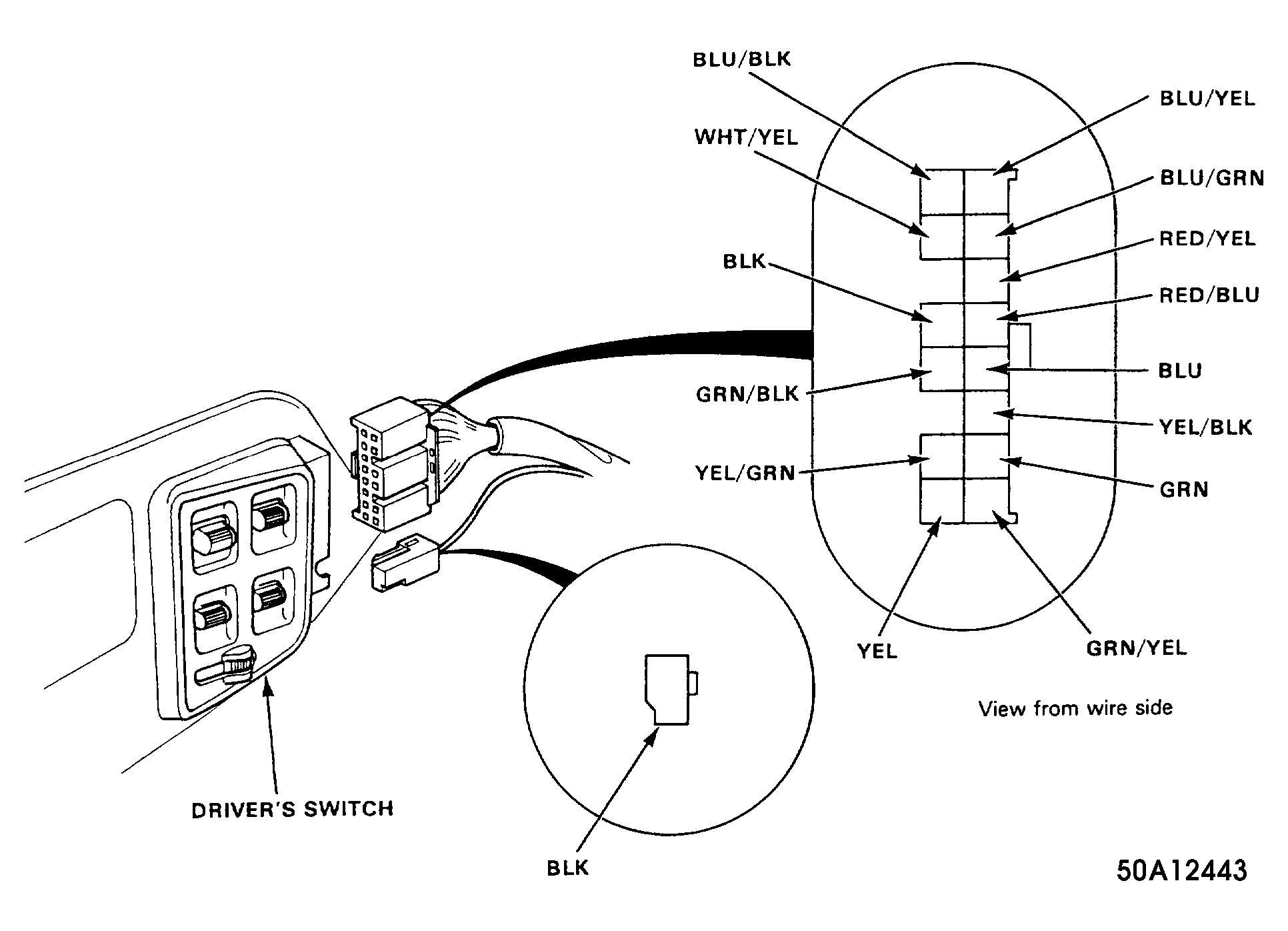 Turn ignition off. Remove driver's door panel. Unplug 14-pin and 1-pin connectors from driver's switch. See Fig 1 . Using a DVOM, perform appropriate switch input tests in Fig 2 . If all input test results are okay, inspect connector and terminals for damage and proper fit. If connector is okay and power windows still malfunction, replace driver's switch.