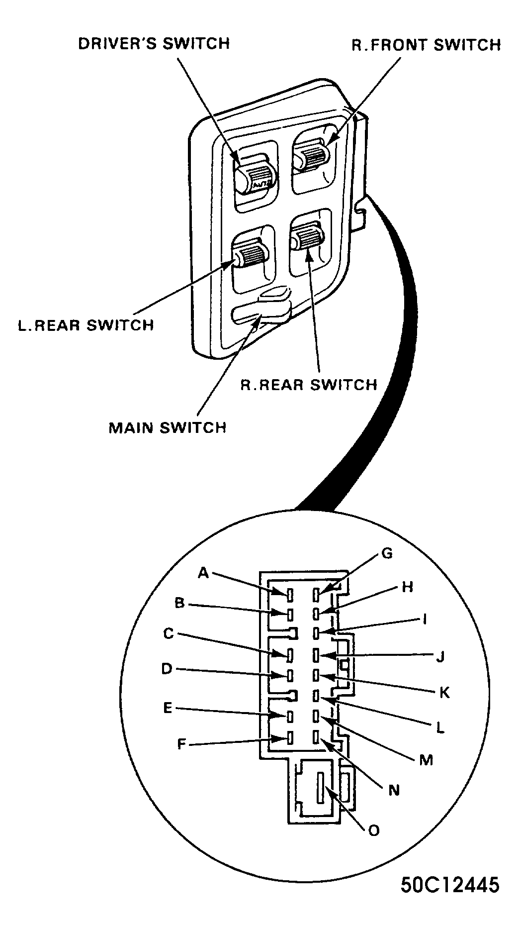 Remove door trim panel. Using an ohmmeter, check resistance of switch terminals with switch in indicated positions. If continuity is not as specified, replace switch. See Fig 1 . See POWER WINDOW DRIVER'S SWITCH CONTINUITY TEST table.