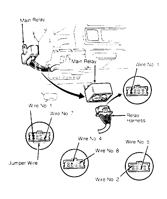 - Connect a jumper wire between terminals No. 5 and 7 of main relay harness. Turn ignition on. Fuel pump should operate. If fuel pump does not operate, check wiring between battery and fuel pump and wiring from fuel pump to ground (Black wire).