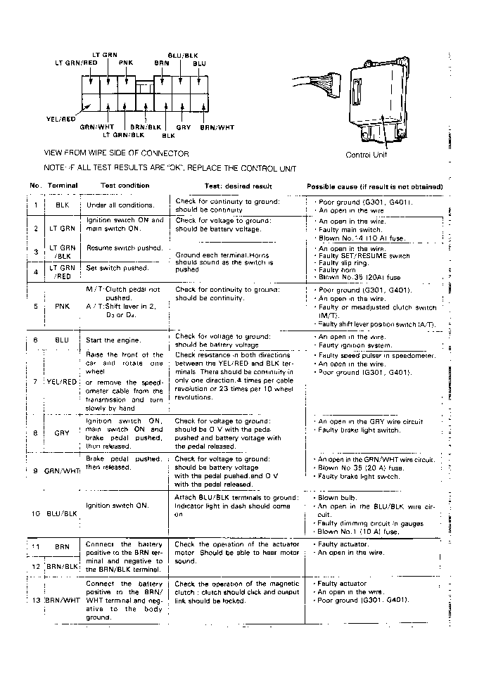 Turn ignition off. Disconnect control unit connector. Using a DVOM, check wire(s) specified under test condition. See Fig 1 . If all test results are okay, replace control unit.