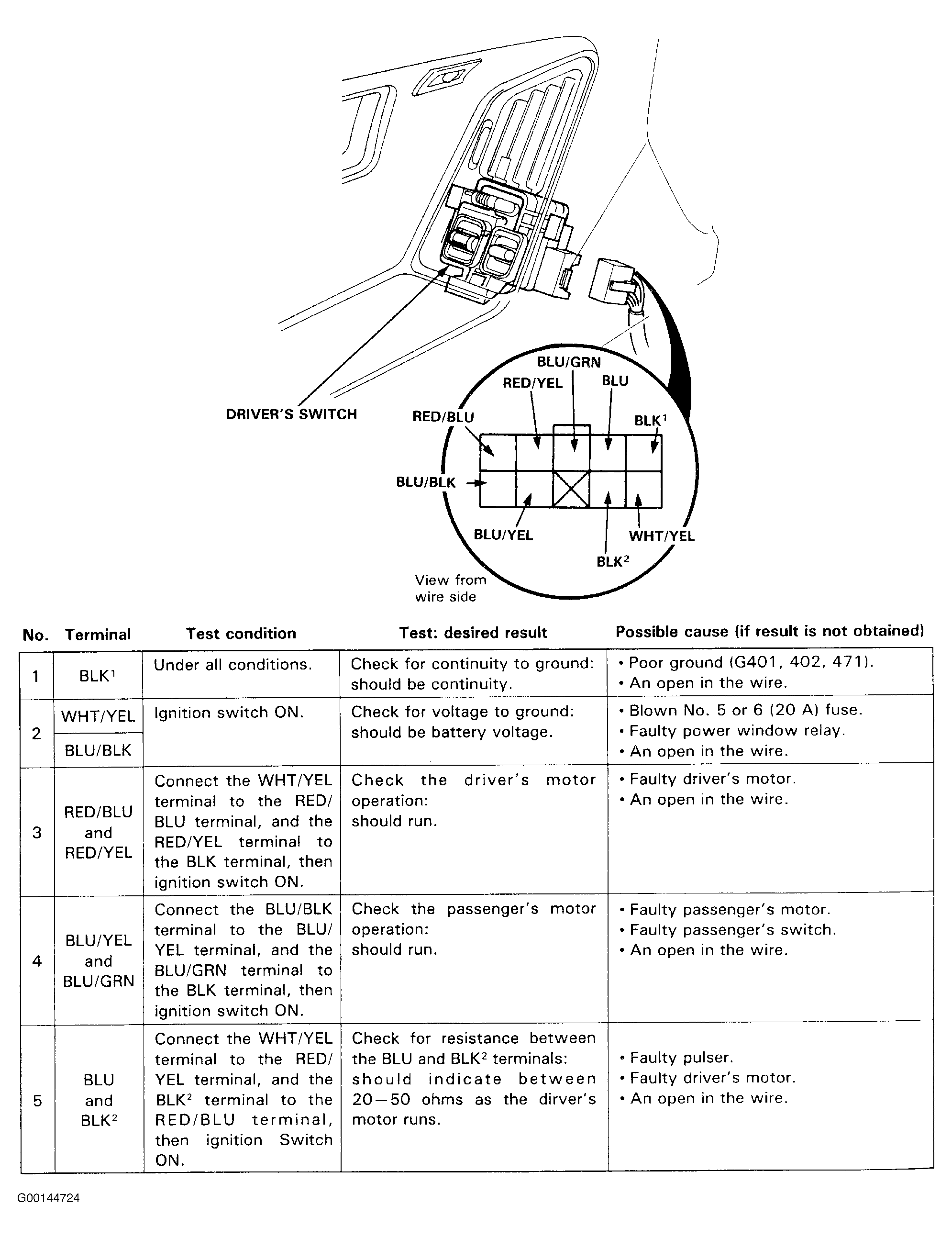 Remove the left door trim panel and disconnect the 10-P connector and remove the driver's switch for the door trim panel. Make input tests at the harness pins. See Fig 1 .