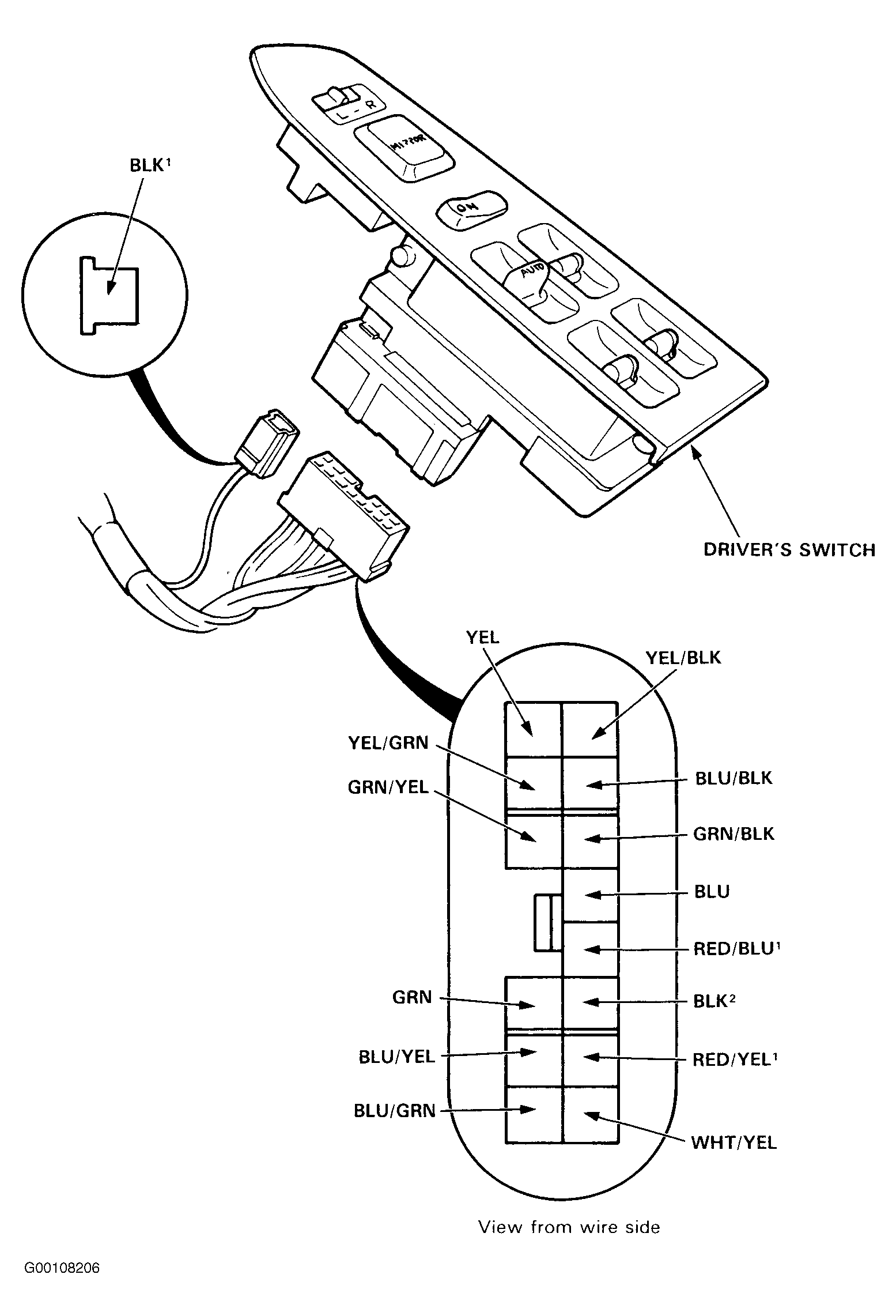 Remove the driver's door trim panel. See DOOR TRIM PANEL under REMOVAL & INSTALLATION. Disconnect the 14-P and 1-P connectors from the driver's switch. See Fig 1 . Make the following input tests at the harness pins. See Fig 2 .
