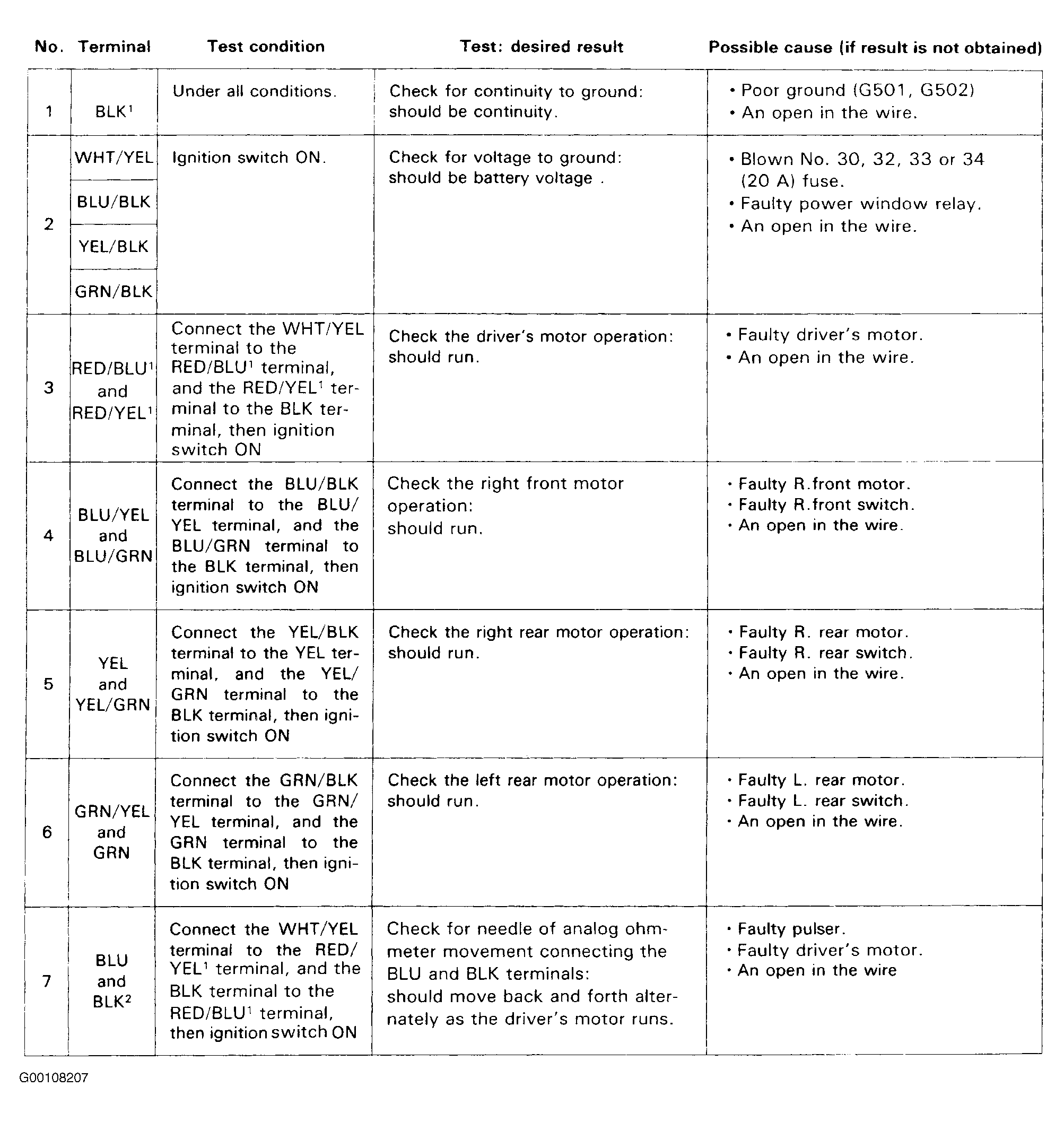 Recheck the connections between the 14-P connector and the driver's switch, then replace the driver's switch if all input tests prove okay.