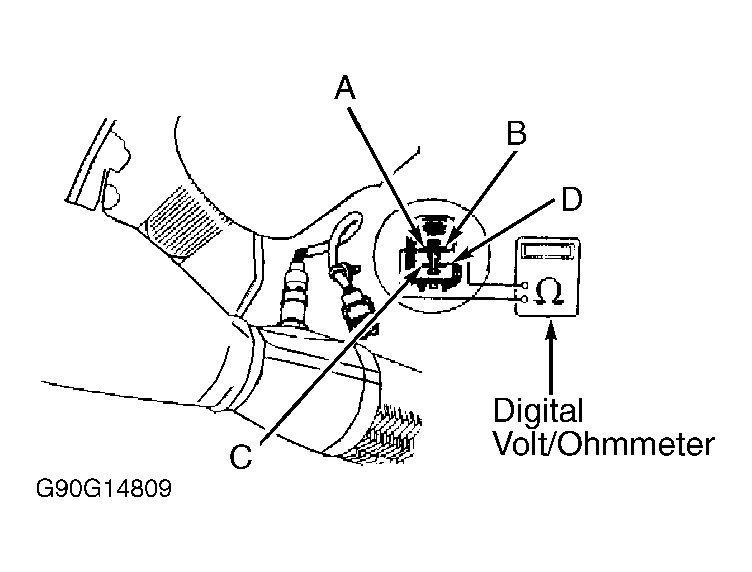 - Turn ignition off. Disconnect 4-wire connector from O2 sensor. Measure resistance between connector terminals "A" and "B" on O2 sensor. See Fig 1