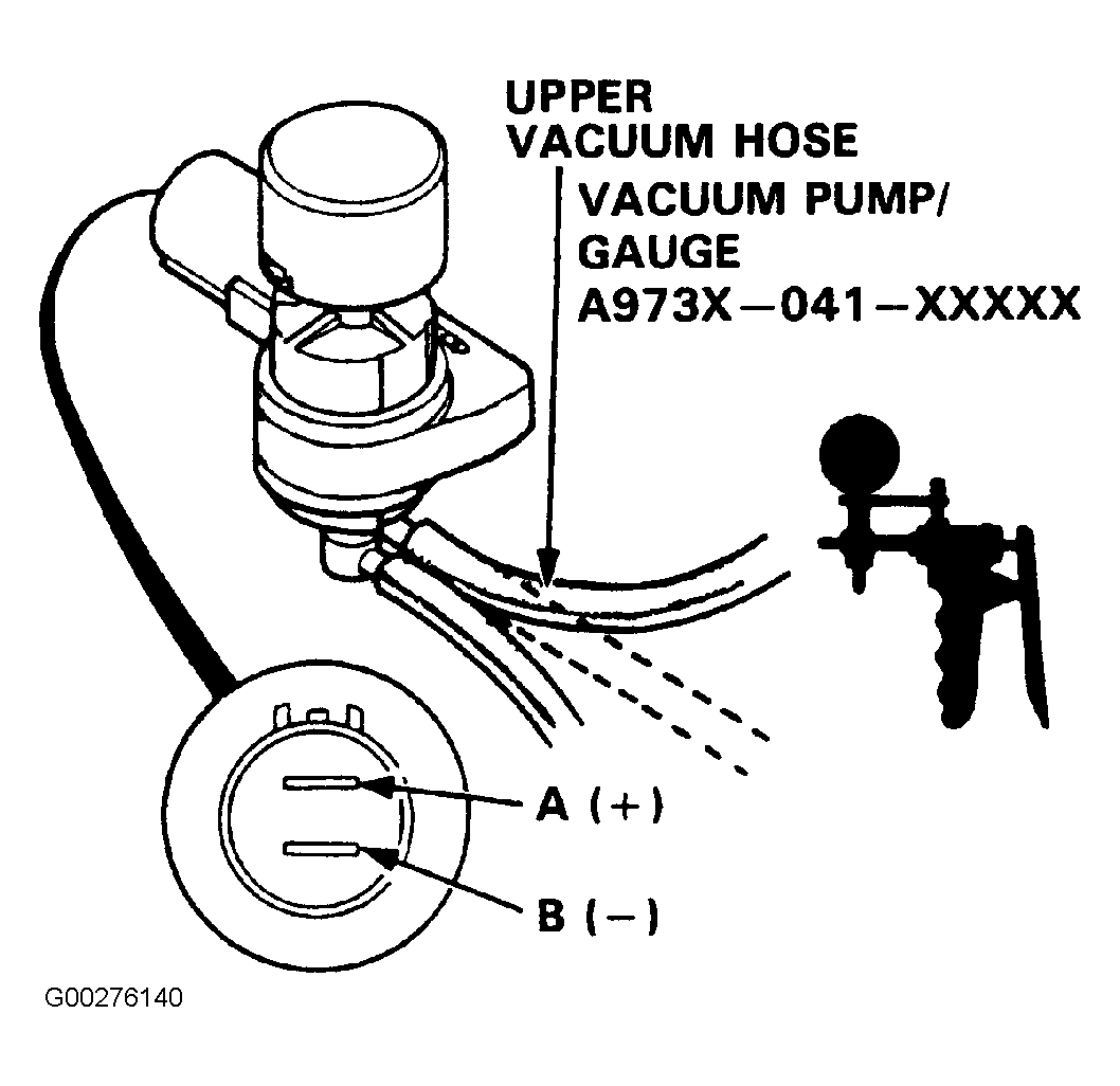 1. Warm up engine to normal operating temperature. Disconnect the upper vacuum hose from the solenoid valve. See Fig 1. Connect vacuum pump/gauge to upper vacuum hose. If there is intake manifold vacuum when the engine is below 750 rpm, go to next step. If there is no intake manifold vacuum, turn ignition switch OFF and disconnect the 2-pin connector from the solenoid valve. Connect battery positive to terminal A, and battery negative to terminal B of the solenoid valve. See Fig 1. Start the engine. If there is intake manifold vacuum, solenoid valve is OK, perform the CONTROL UNIT INPUT TEST . If there is no intake manifold vacuum, replace the solenoid valve.